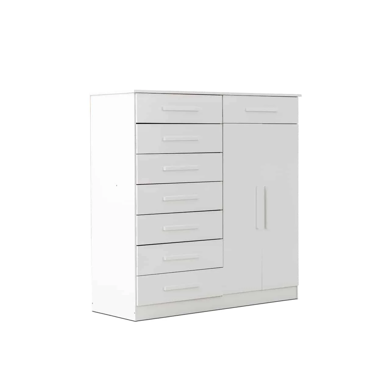 Add a touch of modern style & sophistication to your home with our exclusive range of furniture. Add some needed storage to your bedroom with this modern & compact chest of drawers. Features 8 pulling drawers & a closed drawer with hanger space. Assembly is required.