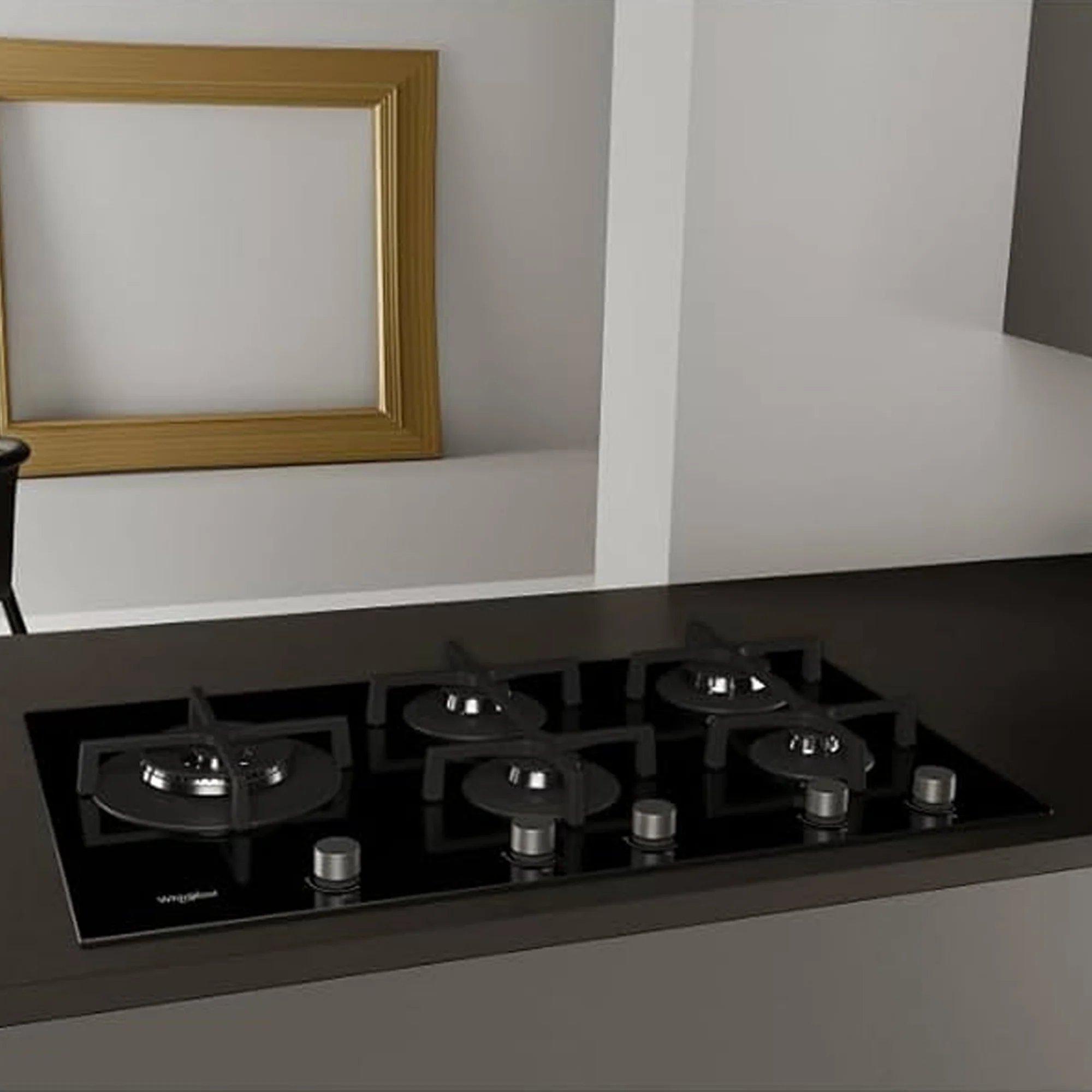 The new stylish Whirlpool 90cm Gas Hob is equipped with an integrated sparking unit that allows you to light any burner immediately. With frontal controls, you do not have to reach over the burners in order to adjust the heat settings.